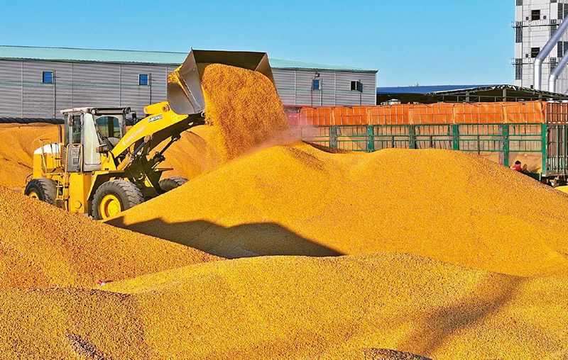 新征程上,要加强重点领域安全能力建设,夯实粮食、能源资源、产供链、战略通道等国家安全基础保障能力。国家统计局数据显示,2025年全国粮食产量14297.5亿斤,比上年增加167.5亿斤,全国粮食实现丰收。图为2025年10月14日,在北大荒集团北安分公司龙镇农场有限公司粮食烘干合作点,铲车正在转运待烘干的玉米(无人机照片)。新华社发 钱泊羽/摄