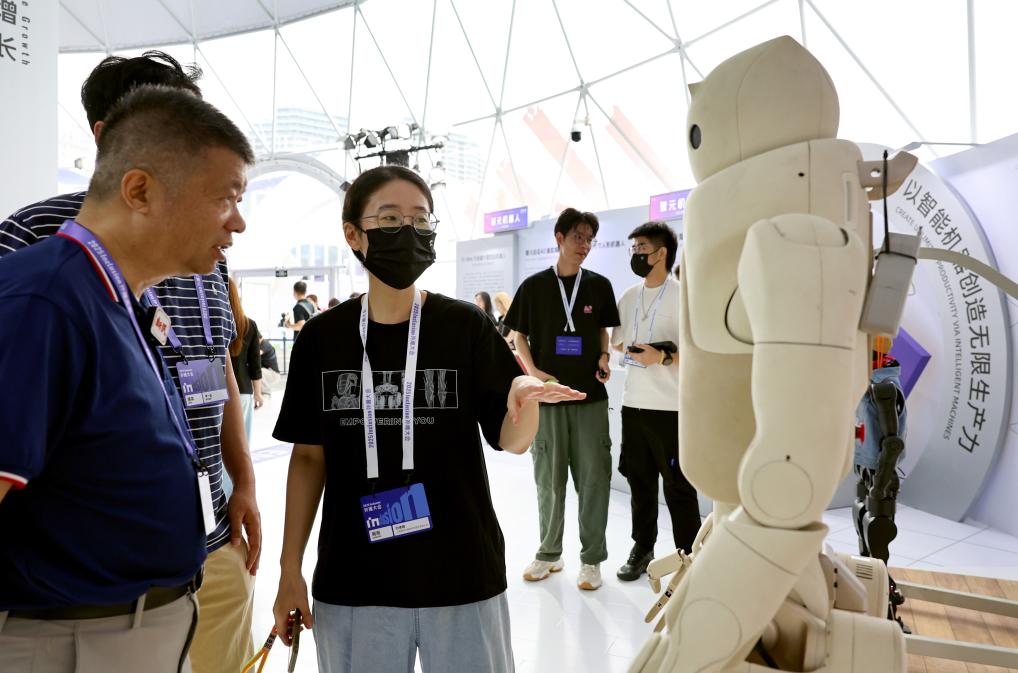 9月10日,工作人员(中)向参观者介绍一款具备触感反馈功能的人形机器人。新华社记者 方喆 摄