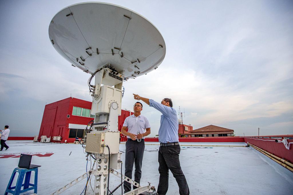 2024年5月17日,在泰国马汉科理工大学,中泰双方工作人员调试低轨通信网络移动信关站。(新华社记者 王腾摄)