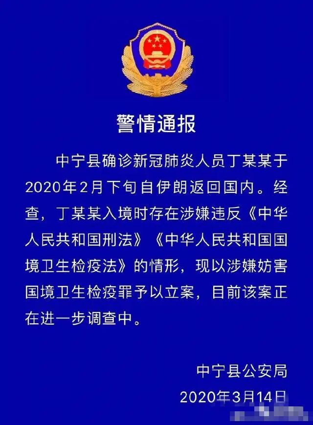 3月16日,北京市召开的疫情防控工作新闻发布会上,北京市公安局副局长、新闻发言人潘绪宏表示,以涉嫌妨害传染病防治罪,已对从美国输入的确诊病例黎某立案侦查。 据此前通报,黎某,女,37岁,长期定居美国马萨诸塞州,在美期间已出现发热、咳嗽等症状,并多次在当地就诊,在美国登机前曾服用退烧药,登机后未如实向乘务人员提供个人健康状况及丈夫、儿子等同行人员情况,给同机人员造成传染风险。 潘绪宏表示,接相关线索后,北京警方迅速开展调查取证。经初步工作,顺义公安分局以涉嫌妨害传染病防治罪,已对黎某立案侦查。 目前,黎某正在定点医院接受治疗,其丈夫、儿子在接受隔离观察。 潘绪宏强调,对虚报信息、隐瞒病情等拒绝执行疫情防控措施的违法犯罪行为,北京警方将坚决打击处理、依法追究责任。 3月15日北京市疫情防控工作例行新闻发布会披露了1例境外输入新冠肺炎确诊病例流行病学调查情况。 租住在经开区荣华街道林肯公园B区的王某某,女,31岁,户籍浙江省台州市。王某某与其爱人蔡某某在未向社区报备的情况下,2月23日私自去泰国旅游。3月4日返回北京后,王某某不仅未主动报备、隐瞒行踪,而且没有按要求自觉落实好居家隔离措施。 3月15日晚20时24分,北京经济技术开发区新闻中心微信公号“北京亦庄”推送通报,对隐瞒行踪相关责任人,公安部门已立案调查。 目前,患者王某某的爱人蔡某某两次核酸检测结果均为阴性,其他三位亲属核酸检测也为阴性。目前已确定的密切接触者已全部转运至定点医院进行医学隔离观察。 3月14日,河南焦作市解放区外宣办通过官方微信通报,该区4人因隐瞒境外回国事实,拒不执行政府禁令,被行政拘留。 3月10日,刘某门、安某雨从境外回到焦作,由刘某运、崔某伟二人驾驶车辆从焦作火车站接回。4人在明知疫情期间从境外回来须向相关部门登记的情况下,隐瞒从境外回国的事实,刻意躲避检查登记,拒不执行政府禁令。 刘某运、刘某门二人在没有小区出入证的情况下翻墙进入小区,安某雨则躲在崔某伟驾驶车辆的后排随车进入小区。 为躲避小区居民举报,违法人员趁夜将车内行李搬运到家。为了方便刘某门和安某雨二人进出小区,刘某运将自己的小区出入证和另一个捡来的其他小区出入证篡改后让刘某门、安某雨二人使用,而其在没有出入证的情况下多次翻墙进出小区。 刘某门、安某雨、刘某运、崔某伟4人拒不遵守疫情防控要求,被发现后刻意隐瞒真相,不配合相关部门调查,根据《中华人民共和国治安管理处罚法》规定,刘某门、安某雨二人分别被决定执行行政拘留十日,刘某运、崔某伟二人分别被决定执行行政拘留七日。 宁夏中宁县公安局3月14日发布警情通报:中宁县确诊新冠肺炎人员丁某某于2月下旬自伊朗返回国内。经查,丁某某入境时存在涉嫌违反《中华人民共和国刑法》《中华人民共和国国境卫生检疫法》的情形,现以涉嫌妨害国境卫生检疫罪予以立案,目前该案正在进一步调查中。 丁某某是宁夏首例境外输入新冠肺炎确诊病例,也是我国首例境外输入病例。2月26日,中卫市发现1例境外输入型新冠肺炎病例。消息指出,该患者丁某某2月19日从伊朗德黑兰乘坐SU513航班抵达俄罗斯莫斯科;2月20日,从莫斯科乘坐SU206次航班抵达上海浦东国际机场。2月22日从上海火车站乘坐Z216次列车,于2月23日抵达兰州。2月23日晚,从兰州乘坐火车于2月24日凌晨抵达中卫。 甘肃临夏市公安局3月15日发布警情通报称:3月13日被临夏市确诊的境外输入性新冠肺炎病例敏某某、张某某,于3月12日自国外返回国内。经查,敏某某、张某某未按规定向在临夏市的居住地相关机构、部门如实报备,违反《中华人民共和国刑法》等相关规定,公安机关已依法对上述二人以涉嫌妨害传染病防治罪立案侦查。 敏某光、敏某丽、苏某明知敏某某、张某某从国外返回国内,未按规定向在临夏市居住地的相关机构、部门如实报备,私自将敏某某、张某某接到临夏市家中,已触犯了《中华人民共和国治安管理处罚法》的相关规定,公安机关依法决定对敏某光、敏某丽、苏某三人分别给予行政拘留十日的处罚。 在网上,境外输入病例最惹网友恼怒的非郭某鹏莫属。他在新冠疫情已在意大利爆发的情况下,坚持飞去意大利米兰看球赛,染上新冠病毒。回国不上报,坐地铁上下班,直接打破了郑州连续13天的疫情0新增,也是河南首例境外输入性确诊病例。 3月11日,郑州市报告首例境外输入性新冠肺炎确诊患者郭某鹏,现在郑州市第六人民医院隔离病区进行治疗,已经确认郑州密切接触者为43人,全部采取集中隔离医学观察,核酸检测结果均为阴性,暂无异常。 3月12日,河南省新冠肺炎疫情防控专题第二十八场新闻发布会通报,患者郭某某返回郑州后隐瞒境外旅居史,涉嫌妨害传染病防治罪,公安机关已立案侦查。河南省公安厅副厅长范玉龙说,“在河南新增病例连续13天清零的情况下,郭某鹏出国前往疫区,返回后行经多地,不如实报告来往真实情况、不按要求配合落实隔离观察措施,多次出入公共场所,多次乘坐公共交通工具,造成多人被隔离的严重后果。一人之行为,造成一城的不安,害人害己。” 3月12日,呼和浩特市新城区公安分局成吉思汗派出所在新冠肺炎疫情防控工作中发现:呼和浩特市新城区某小区住户赵某、莎某(姐妹关系),3月7日从